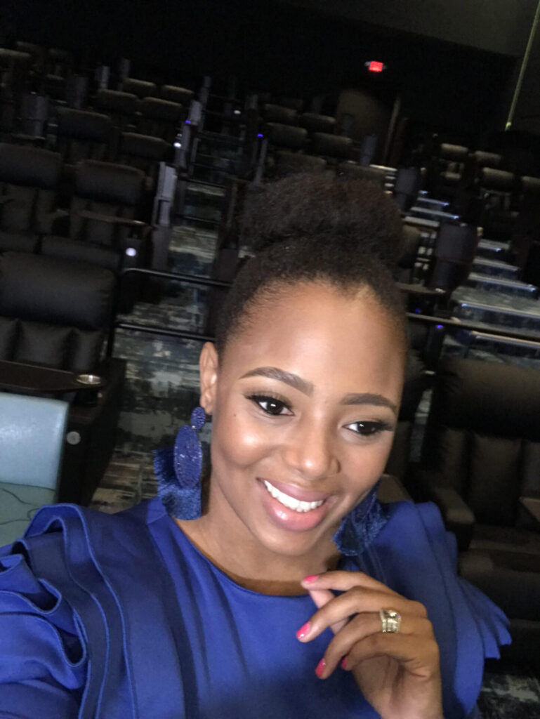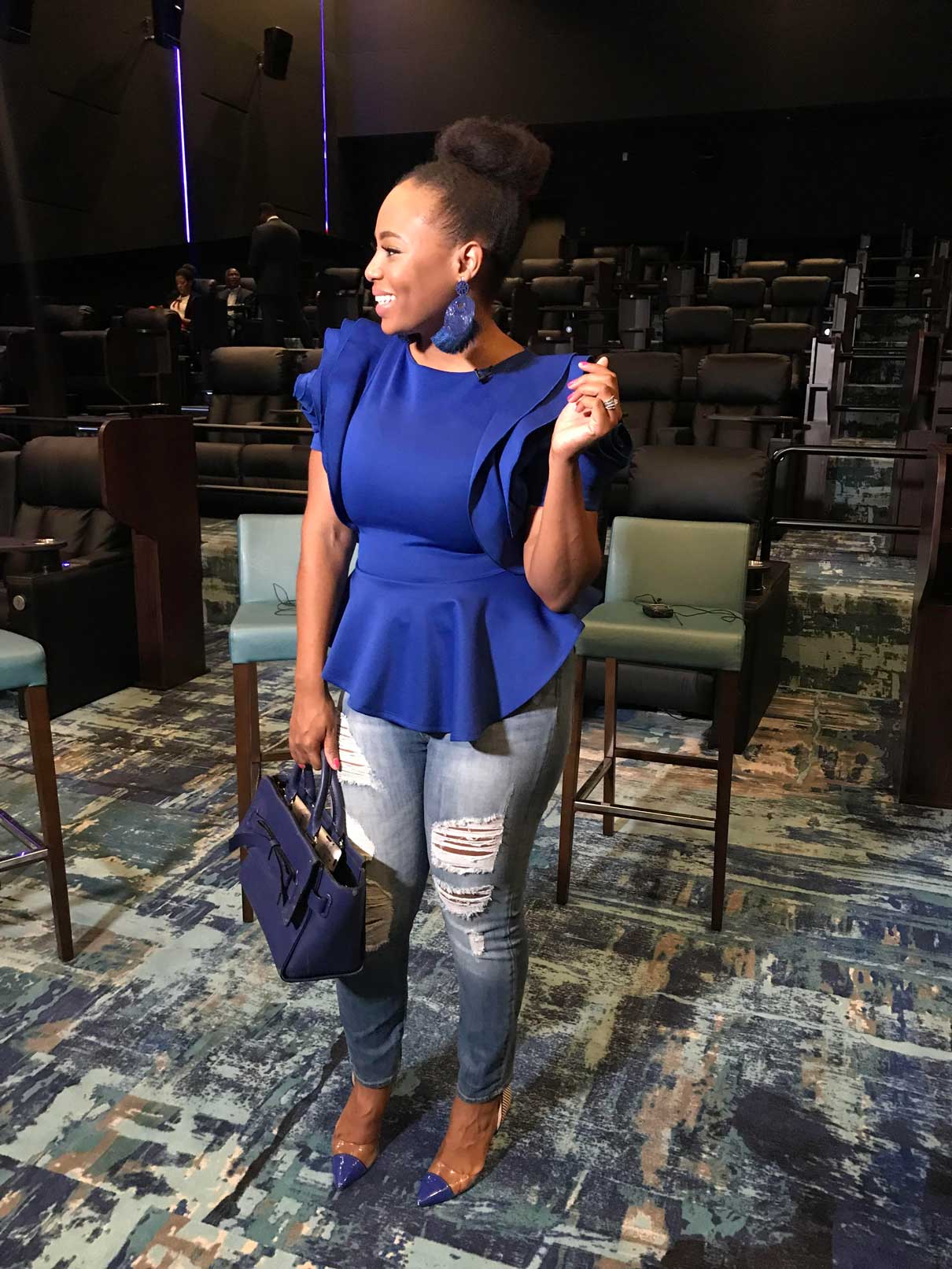 I decided to go with a classy top that can be worn anywhere and I paired it with ripped jeans for a more casual “I’m at the movies” effect. Blue pumps and my Kate Spade bag turned the “casual” look up a notch to “classic”, while fun large earrings made my face pop since I had my hair pulled up and completed the look for a little chic. At your request, I’ve listed all the details below.